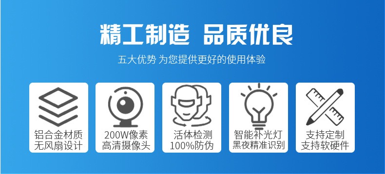 设备采用进口德国海曼5.0测温头,内置可见光和红外摄像头,具备自动人脸识别测温,快速毫秒级检测额头热感温度,测温准确率>99.7%,测温精准度是土0.3°C,精准显示温度值。